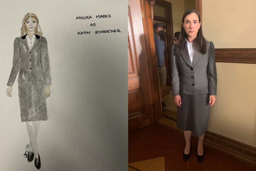 Custom houndstooth black and grey wool skirt suit with velvet trim and buttons worn by Annika Marks "Kathy Schroeder" for her shocking testimony against the Branch Davidians after she flipped. This suit is a recreation of the suit she wore to court on the day she testified.