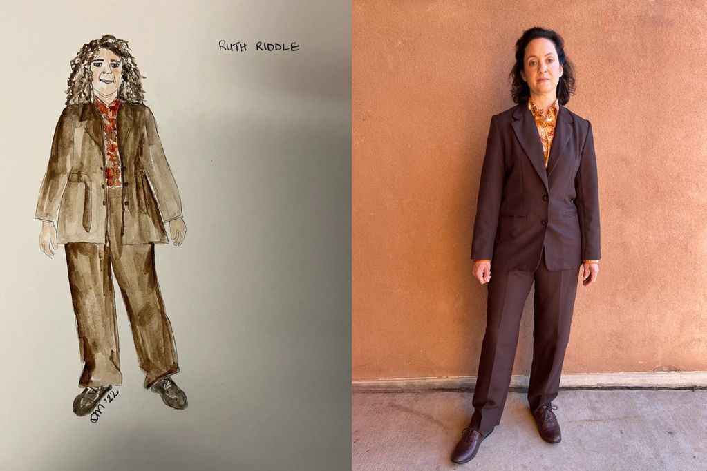 All of Ruth's possessions were burned in the fire during the siege on the Branch Davidian compound. This dress was designed based on a dress we know she was given to wear by her lawyer to "soften" her appearance and gain sympathy from the jury.